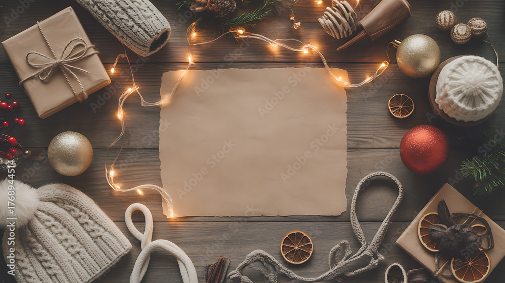 Christmas-themed flat lay with gift box, fairy lights, ornaments, and winter accessories on wooden background #1768944514