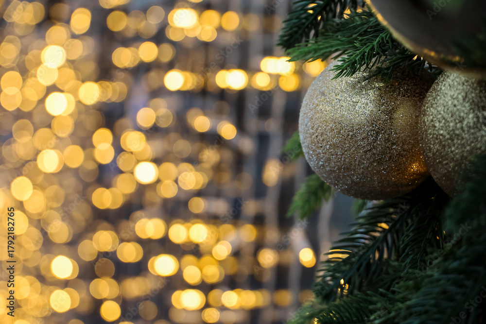 Christmas toy balls and festive illumination, golden lights on background. New Year tree with toys #1792182765