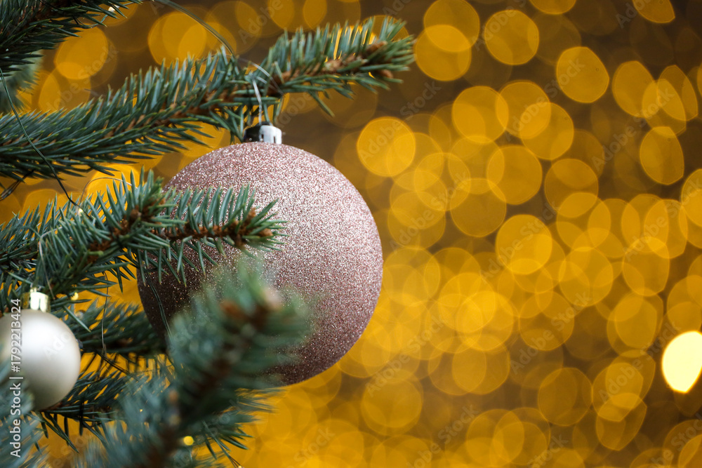 Christmas toy balls and festive illumination, golden lights on background. New Year tree with toys #1792213424