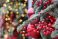 Christmas toys and festive illumination, golden lights on background. New Year tree with toys #1801871836
