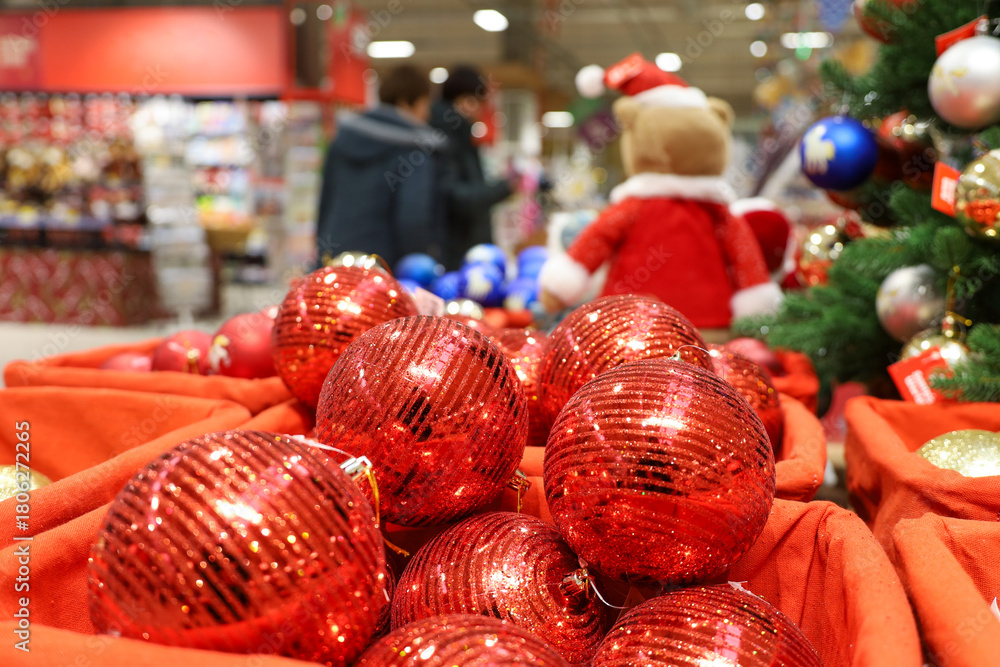 Christmas toys, red balls in baskets on blurred customers background. New Year decorations in a superstore #1806272265