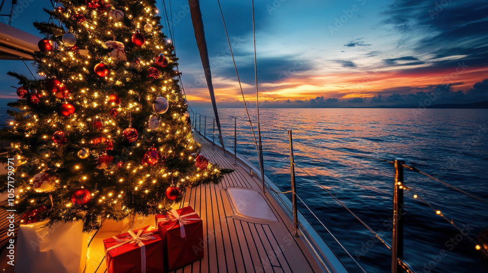 Christmas tree with presents illuminating yacht deck at sunset #1057179971