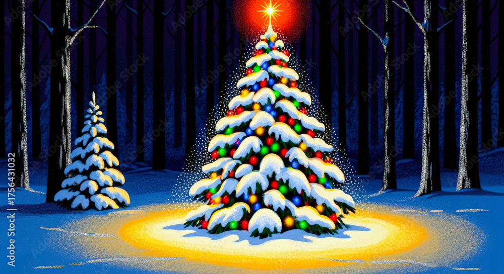 Christmas tree with star and colorful lights covered in snow in a nighttime forest. Winter wonderland scene for Holiday and New Year celebration. #1756431032