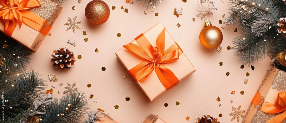 Christmas Wrapped gift boxes with orange satin ribbons, complemented by chic tree ornaments, golden balls, sparkling snowflakes, confetti on pastel background #1766157166