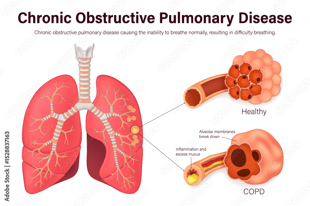 Chronic obstructive pulmonary disease (COPD). Comparison between normal bronchus and alveoli with bronchitis and emphysema. Human respiratory system. #1528837163