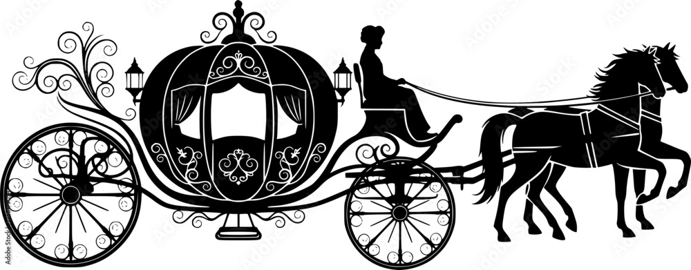 cinderella carriage silhouette. This image shows a detailed and ornate silhouette of a Cinderella carriage, also known as a fairytale coach. Vector clipart illustration design #1758179054