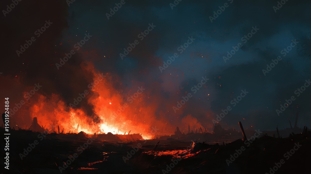 Cinematic digital painting of a burning battlefield with ruined trenches at night #1901924884