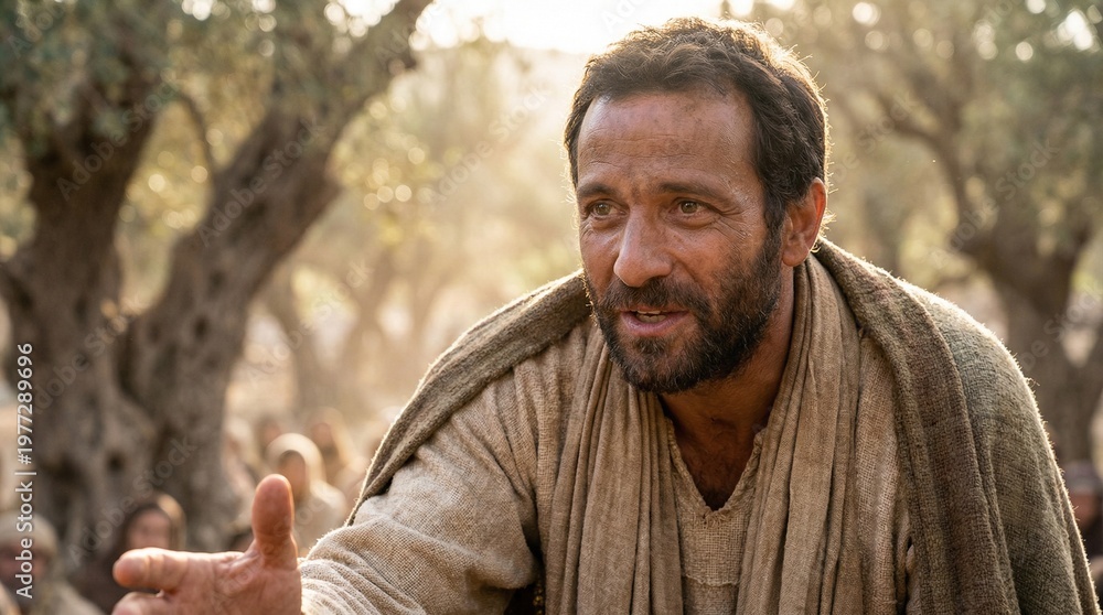 Cinematic portrait of an ancient Middle Eastern man in a traditional tunic, biblical disciple or apostle gesturing in an olive grove at sunset. #1977289696