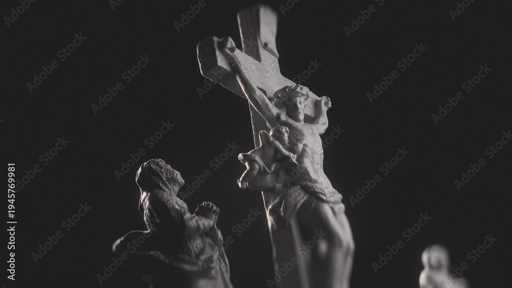Cinematic View of Grieving Figure Statue Looking Up and Praying to Jesus Christ on Cross, Highlighted by Dramatic Light in Darkness. Spiritual Concept of Prayer and Humility. Praying Figure and Cross. #1945769981