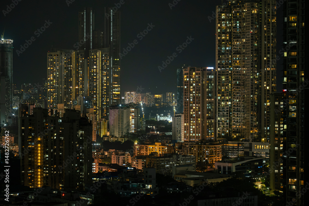 Cinematic view of Mumbai city at night. Mumbai's iconic financial district with this stunning cityscape view. Shot of Mumbai Skyline, high-rise buildings at South Mumbai, Maharashtra India. #1482726762