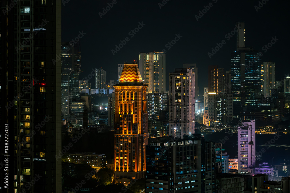 Cinematic view of Mumbai city at night. Mumbai's iconic financial district with this stunning cityscape view. Shot of Mumbai Skyline, high-rise buildings at South Mumbai, Maharashtra India. #1482727031
