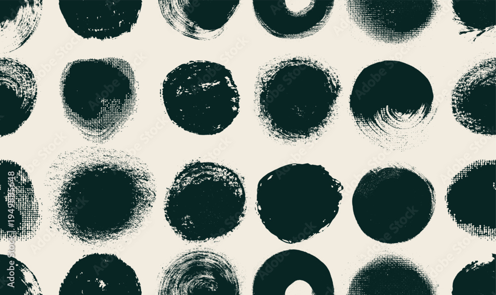 Circle grunge seamless pattern stamps and seals set with hand drawn rough round shapes. Sun symbols, brush stroke circles and dots inspired by Japanese and Chinese calligraphy. Vector elements pattern #1949885648