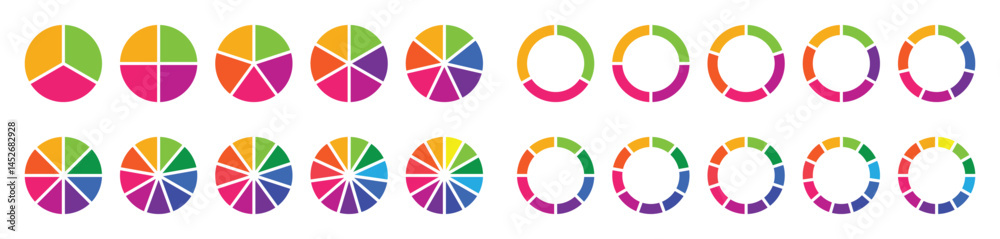 Circle pie chart diagram. Pie chart set, segmented circle icons. Pie chart divided 1,2,3,4,5,6,7,8,9,10,11,12 equal parts. Infographic wheel segment or section parts. Circle section graph. Vector set #1452682928