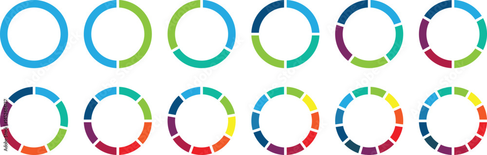 Circle pie chart diagram. Pie chart set, segmented circle icons. Pie chart divided 1,2,3,4,5,6,7,8,9,10,11,12 equal parts. Infographic wheel segment or section parts. Circle section graph. Vector set #1452684127