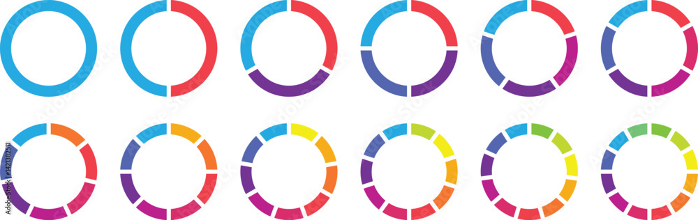 Circle pie chart diagram. 1,2,3,4,5,6,7,8,9,10,11,12 sections or steps. Circle section graph. Colorful Pie chart set. Flat process cycle. Progress sectors. Circular chart. Vector infographic #1421382511