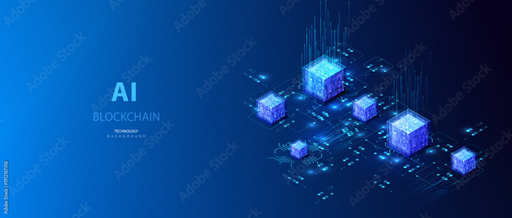 Circuit board with blockchain cube in glowing blue tones. Cybersecurity and digital blocks infrastructure. Ai netowork technology big data concept. #1912167016