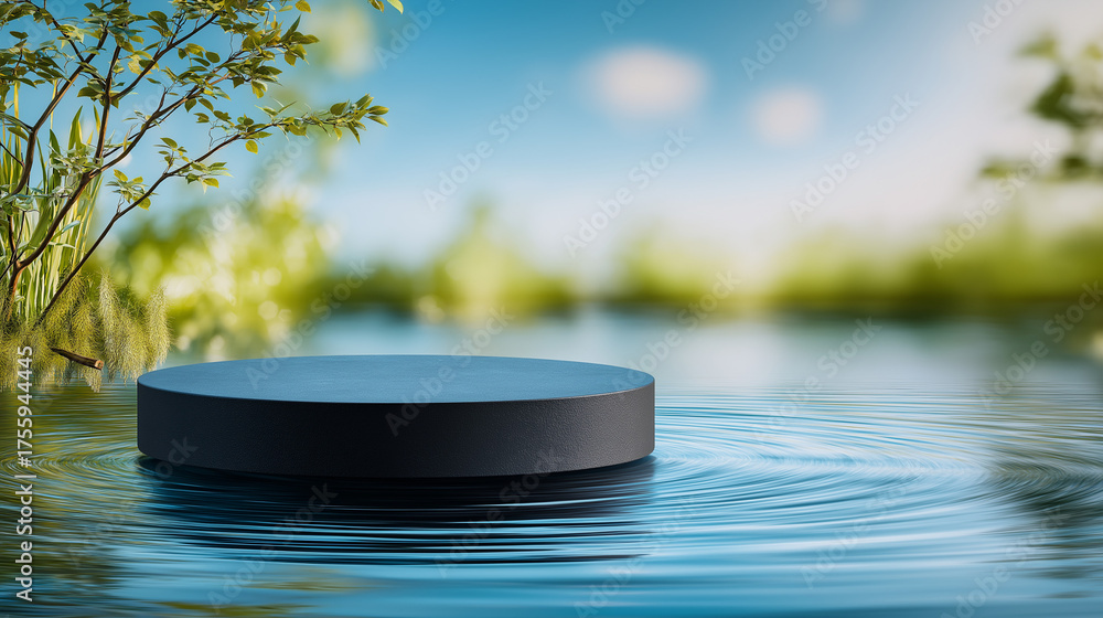 Circular platform, round podium for product display in pond with calm and clear blue water. Showcase in outdoor spring nature background #1755944445