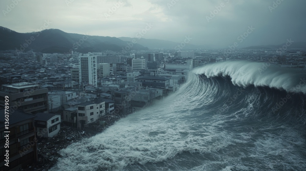 City buldings and giant tide wave ravaging coast town in a hurricane storm. #1360778909