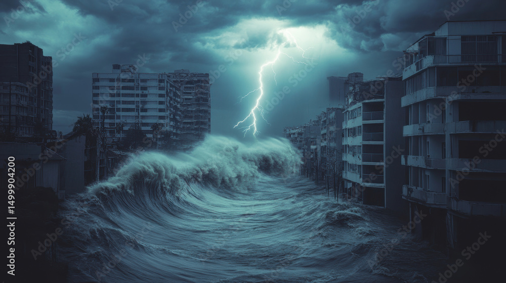 City buldings and giant tide wave ravaging coast town in a hurricane storm. #1499904200