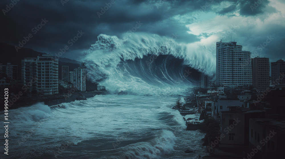 City buldings and giant tide wave ravaging coast town in a hurricane storm. #1499904203