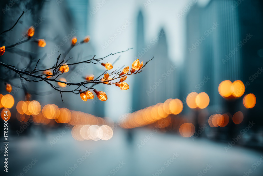 City evening lights with glowing garland on tree branch and blurred street background #1782500654