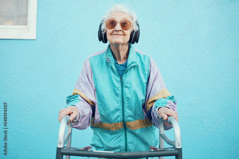 City, fashion and senior woman with headphones listening to music, audio and radio on blue background wall. Freedom, style and elderly female with modern, urban and trendy clothes with walker in town #548194307