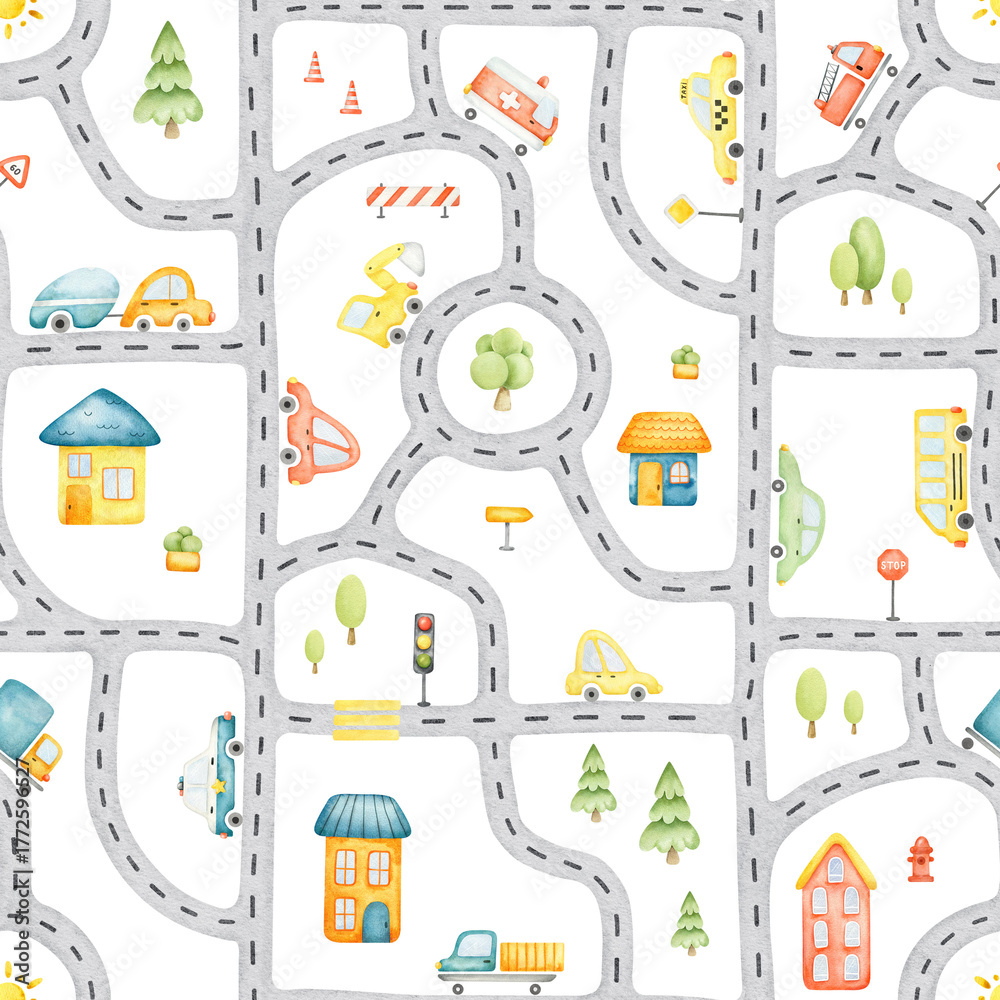 City map with road, cars, stop light, houses and trees. Watercolor hand drawn kid seamless pattern. Background of town landscape for childrens carpet, fabric, textile, playmat, bedding, stationery #1772596527
