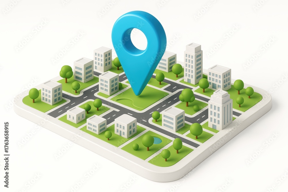 City Navigation Concept: An artistic representation of a city map. Featuring buildings and streets, complete with a location marker, it symbolizes the essence of navigation and urban planning. #1763658915