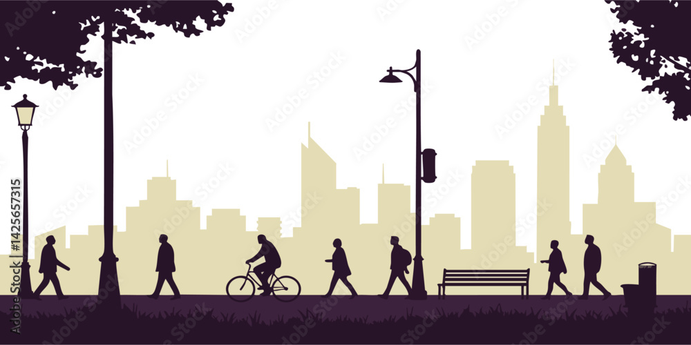 City park silhouette scene with people walking and biking vector illustration #1425657315