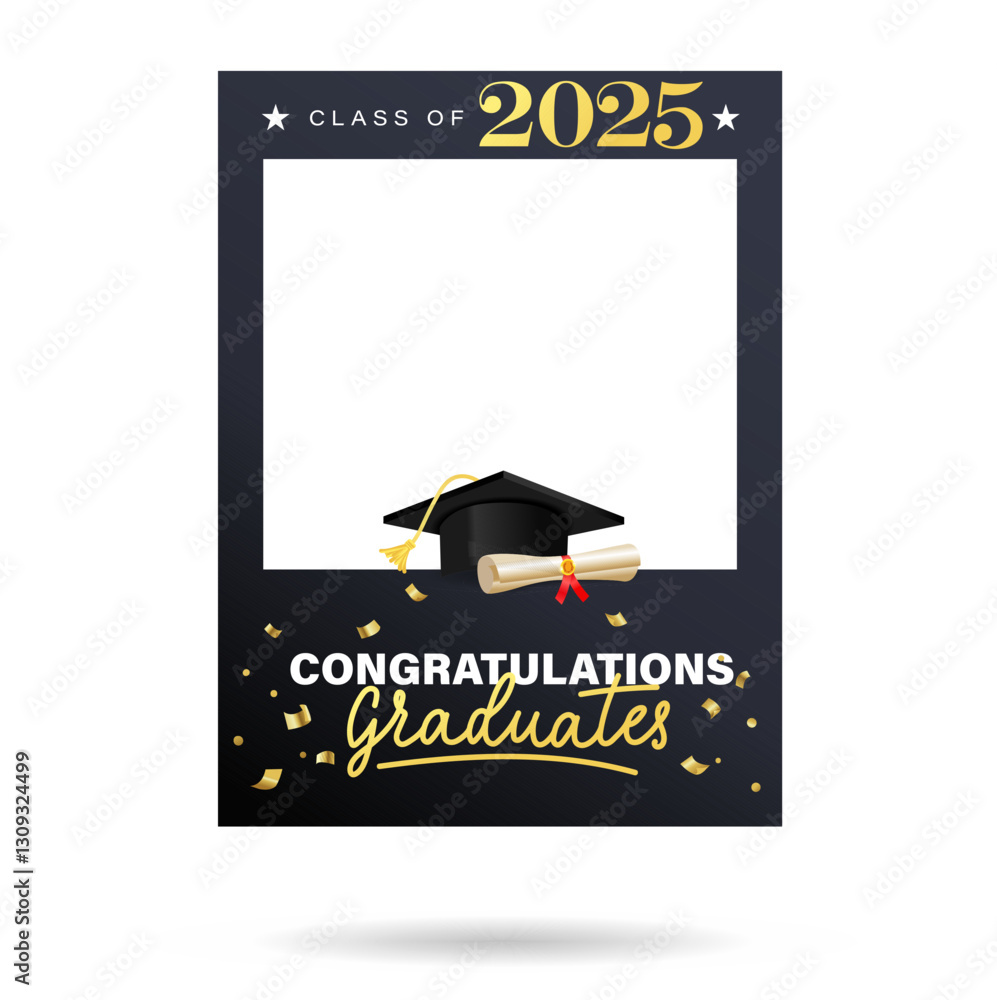 Class of 2025 black and gold design template for graduation photo booth props. Congratulations graduates frame for selfie. Realistic Vector illustration for high school or university grad ceremony. #1309324499