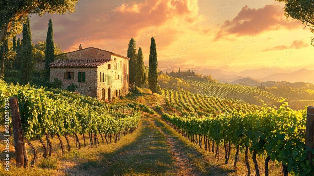 Classic European winefield scene with old Italian villa among vibrant grapevines, dreamy warm light and traditional vineyard elements #1930281987