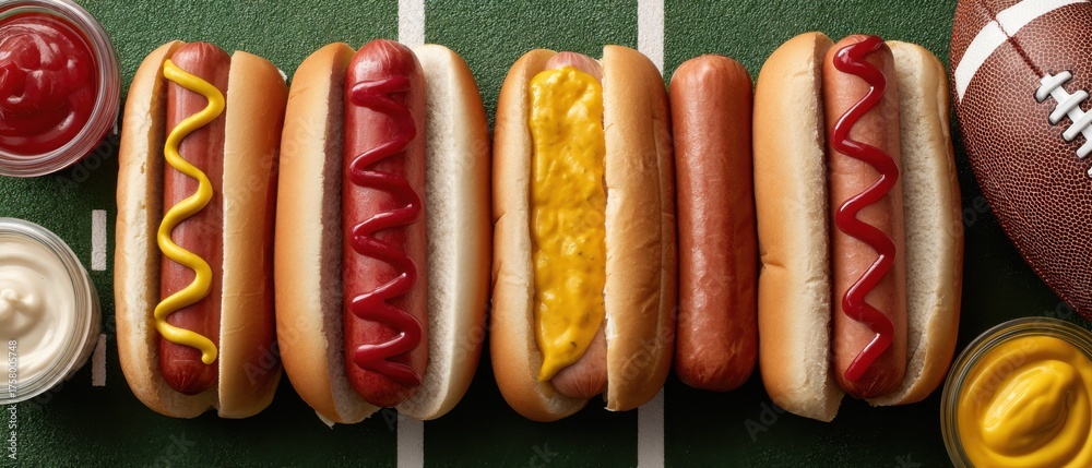 Classic Hotdogs and Stadium Food Tray with Condiments on Gridiron Table Premium Game Day Snack Concept for Sports Marketing and Social Media #1758005748