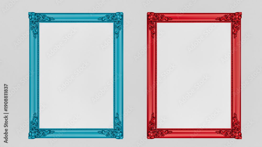 Classic vintage picture frames in blue and red colors on gray background. #1908811837