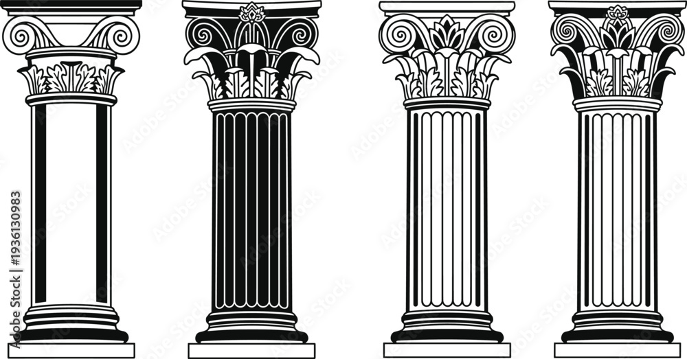 Classical Greek Roman columns set, antique architectural pillar capitals, ancient temple architecture elements, decorative column vector illustration #1936130983
