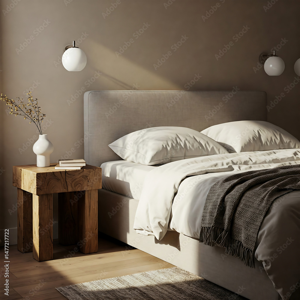 Clean and modern bedroom featuring a comfortable bed with crisp white bedding, a contemporary nightstand with a lamp, and light wood flooring #1477217722
