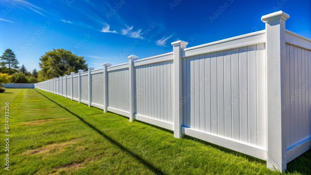 Clean white vinyl panel fence stretches horizontally into the distance, with a slight angle, against a clear blue sky background. #874913236