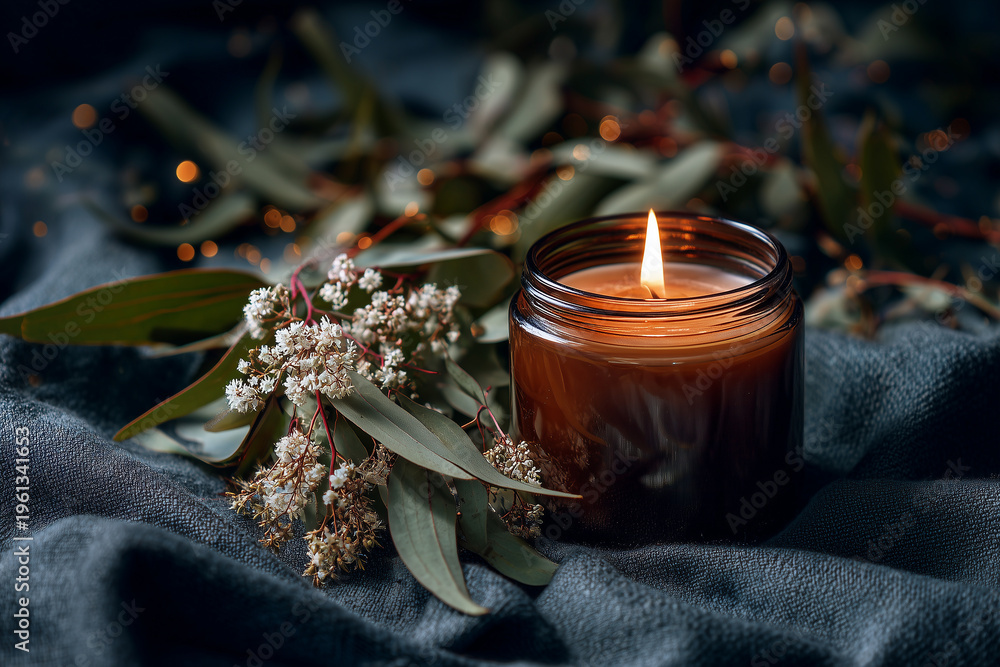 Clear glass jar with lit candle surrounded by eucalyptus leaves and white flowers on dark linen, 45-degree side angle on deep navy background, concept of calm summer night and cozy evenings. #1961341653
