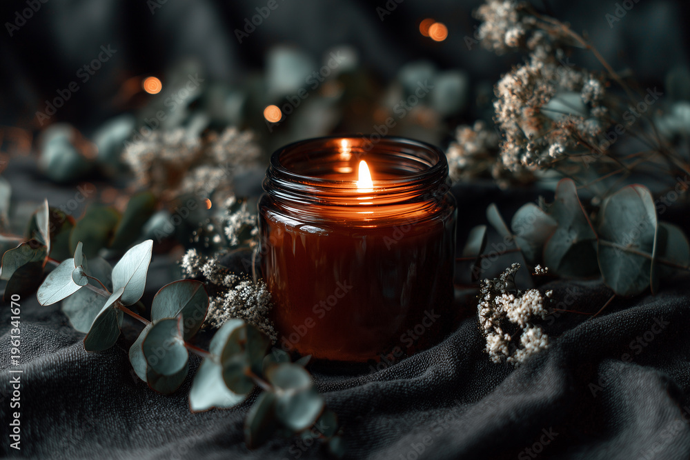 Clear glass jar with lit candle surrounded by eucalyptus leaves and white flowers on dark linen, 45-degree side angle on deep navy background, concept of calm summer night and cozy evenings. #1961341670