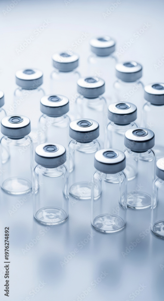 Clear glass vial silver cap medical vial clinical storage sterile arrangement calm clinical light #1976274892
