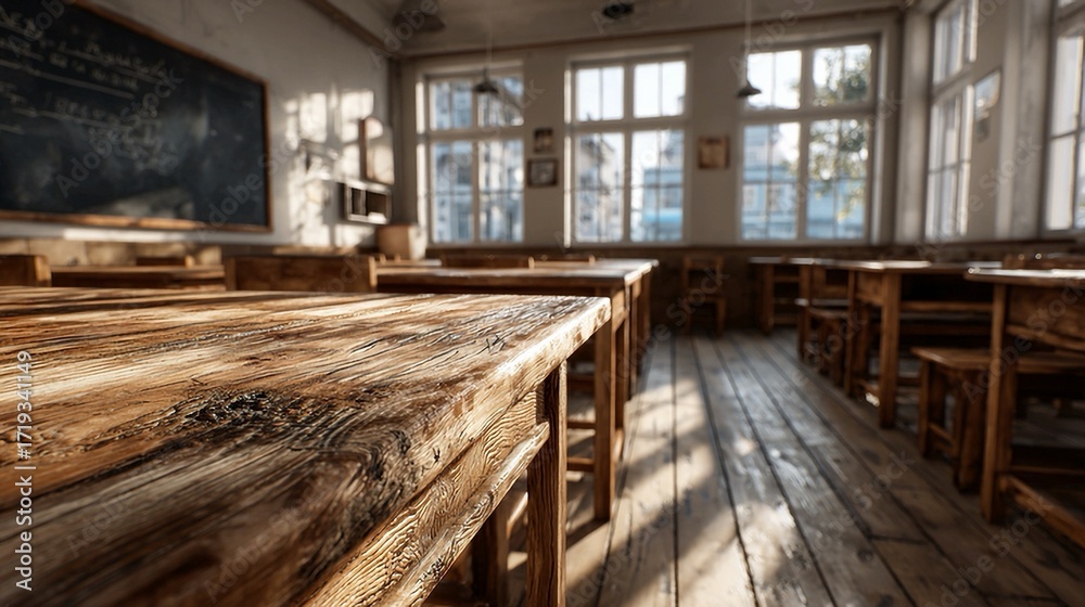 Clear, high quality empty classroom background with detailed wooden desks, bright sunlight from windows, and realistic architectural interior details. #1719341149