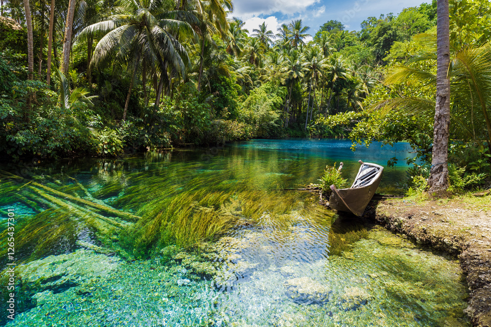 Clear lake with blue water and old boat in tropical forest in Indonesia. #1265437301