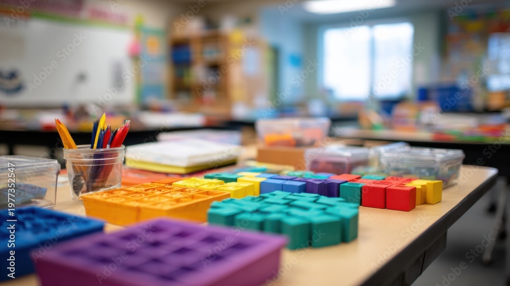 Clear view of a math workshop table featuring bright colored fraction tiles in focus with geometry station materials softly out of focus nearby. #1977352547