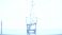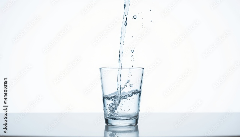 Clear water is being poured into a transparent glass on a reflective surface with a white background. #1446003154