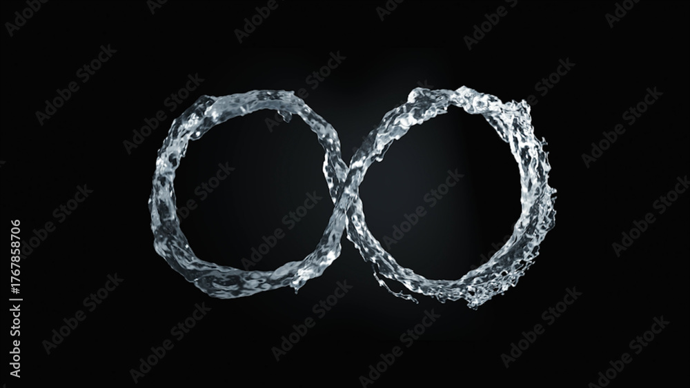 Clear water stream forming an endless infinity symbol, representing concepts of continuous flow, purity, recycling, and sustainability against a clean dark backdrop. 3d rendering #1767858706