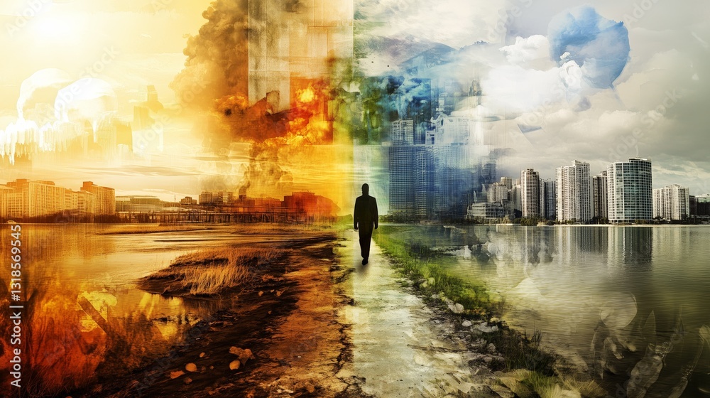 Climate change awareness art depicts a man walking towards a ravaged city. A dystopian future is shown. AI generated #1318569545