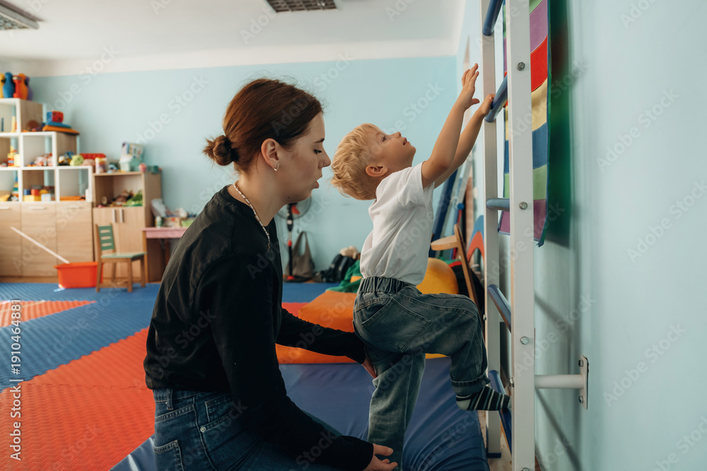 Climbing the ladder that is on the wall. Preschool child with teacher during developmental activities in a playroom #1910464881