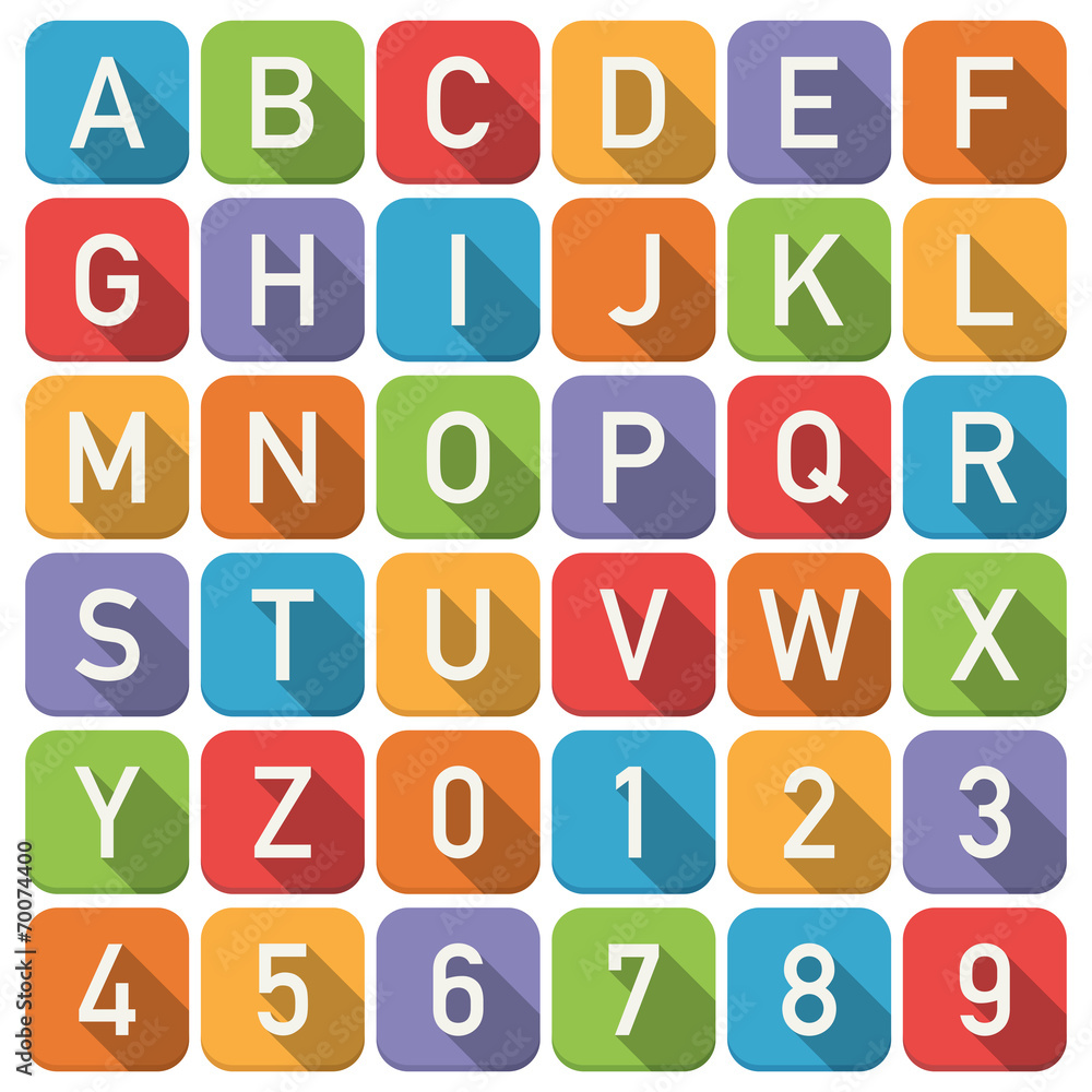 Clipart set of square vector bright color alphabet icons isolated on white #70074400