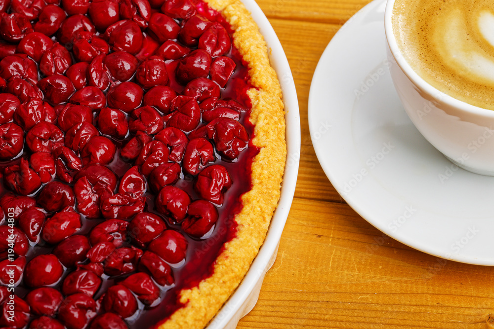 Clodeup homemade berry pie with cherry and cup of coffee cappuccino on wooden table. #1941644803