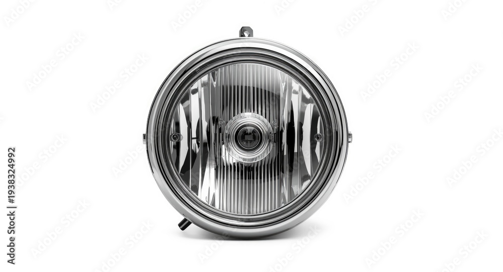 Close frontal capture of a retro round chrome vehicle headlight isolated with white background #1938324992