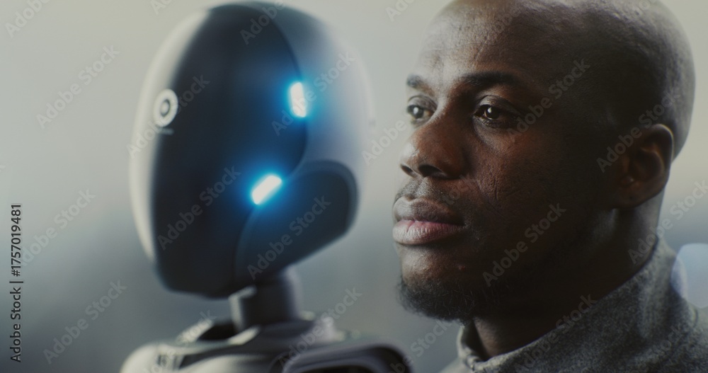 Close up African American Engineer Next to Glowing AI Robot in Moody, Futuristic Factory. Human Robot Collaboration, Advanced Technology, and Integration of AI Into Complex, Industrial Environments. #1757019481